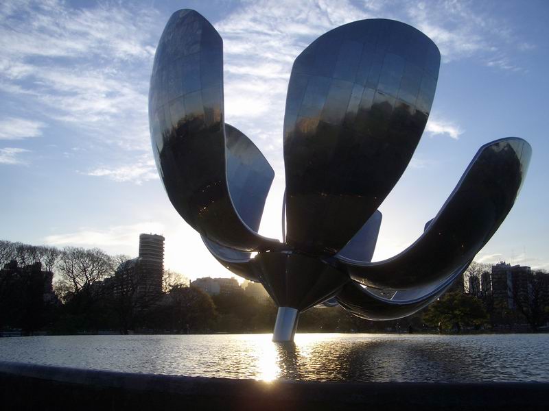 We walk by the side of the museum and we can see to our right the large greek-temple-like massive building of the Law School of the University of Buenos Aires and to our right a beautiful and unique piece of art: the generic flower (Floralis Generica). The 'Floralis Generica' is a gigantic mobile sculpture with a flower shape. It opens with the sunlight and closes during the night. Donated to the city by the arquitect Eduardo Catalano (costed him 5 million dollars), it has six metallic petals of almost 26 meters height. The flower opens by means of a computerized hydraulic device in the morning and closes during the sunset. It is located atop a water mirror, surrounded by a cascade-water fountain. The flower stays completely open during national holidays, Christmas and New Year's Eve. It is beautiful by day and also by night, as it is colourfully iliminated.