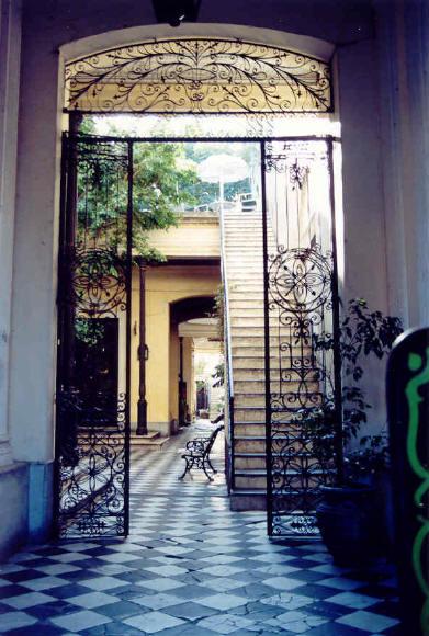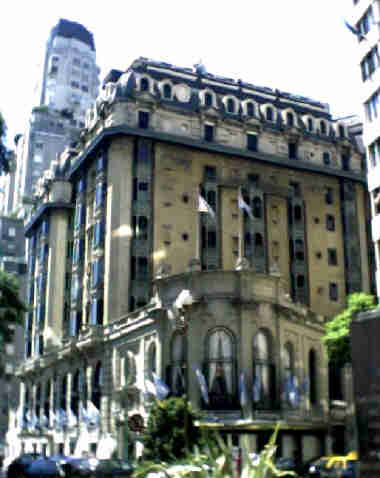 Now we walk down to Arroyo St., but first we glance at the large Strugamou Palace (1924). In this case it is not really a palace but a strata building, though it is nicknamed this way because of its beauty and quality. Arroyo St. has an european flair to it because of the style of its buildings and because it is a rather narrow, winding street as opposed to the rest of the city. It is lined with art galleries and expensive antique shops, and once a month the whole street is closed to traffic, the street is filled with music, and art galleries offer champagne and hors-de-oeuvres to the public till late at night (usually the last friday of each month, except for January and February, in which most people who can leave the city for the holidays at the beaches). This monthly event is called "Gallery Nights". As we walk down Arroyo (brook) street, we should look up at the entrance of the Sofitel Hotel, and see the Mihanovich/Bencich Tower: the first freestanding (tower-like) building erected in BA (1920s) whose top imitates the tomb of greek King Mausolo (hence Mausoleum) built around bc377, now recycled into a fashionable Hotel.