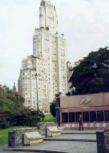 At the end of the short Arroyo St. we find the impront on the wall, of what used to be a small peautiful palace-like building, demolished by a single bomb blast on the morning of March 17 1992: these are the remains of the embassy of Israel, where 22 people died. The naighbouring buildings were shattered to pieces and glass windows were broken around the block. The glass-covered high-rise building right across had to be evacuated and repaired and scaffolding was withdrawn only recently.