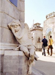 But Recoleta is not only a story of past power and glory. It is a place that is part of Buenos Aires everyday life. Cemetery custodians polish marble, cradle cats, chat on tomb steps and may open tomb doors for travelers who want to see an interior. (A tip is always welcome, but not mandatory.) Many tombs are lovingly personal, with interiors -- visible through windows or doors -- adorned with symbolic objects and mementoes: exquisite lace cloths over a coffin, a cross encrusted with gems. Behind one wrought-iron door there is a broken chair of carved wood and cane. Inside another there is a black and white photograph of a beautiful woman in a white feather boa.