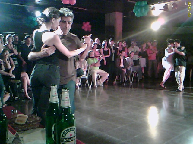 You dress casual (ladies, please do not bring along heavy purses or bags) and we pick you up at the lobby of your hotel between 7:00 pm and 7:15 pm. We then take you to a real tango ballroom (in local lingo we call them ‘Milongas’ which is both the name of a form of tango and a generic denomination for place where you dance). When you arrive there, people may already be dancing. If you join the tango lessons, at the beginners level there is usually plenty of people, and you will be asked to watch and listen to the explanation of the basics (for a few minutes) and then you will be invited to try doing and imitating what has been just explained. (top...)