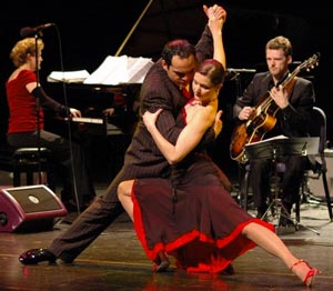 They looked desperately for a distraction to ease their sense of rootlessness and disfranchisement as "strangers in a strange land." From this heady, intermingled cultural brew emerged a new music which became the tango. Though musical historians argue as to its exact origins, it is generally accepted that the tango borrowed from many nations--the relentless rhythms that the African slaves--the candombe--beat on their drums (known as tan-go); the popular music of the pampas (flatlands) known as the milonga, which combined Indian rhythms with the music of early Spanish colonists; and other influences, including Latin. Some say the word "tango" comes from the Latin word tangere (to touch.) (top...)